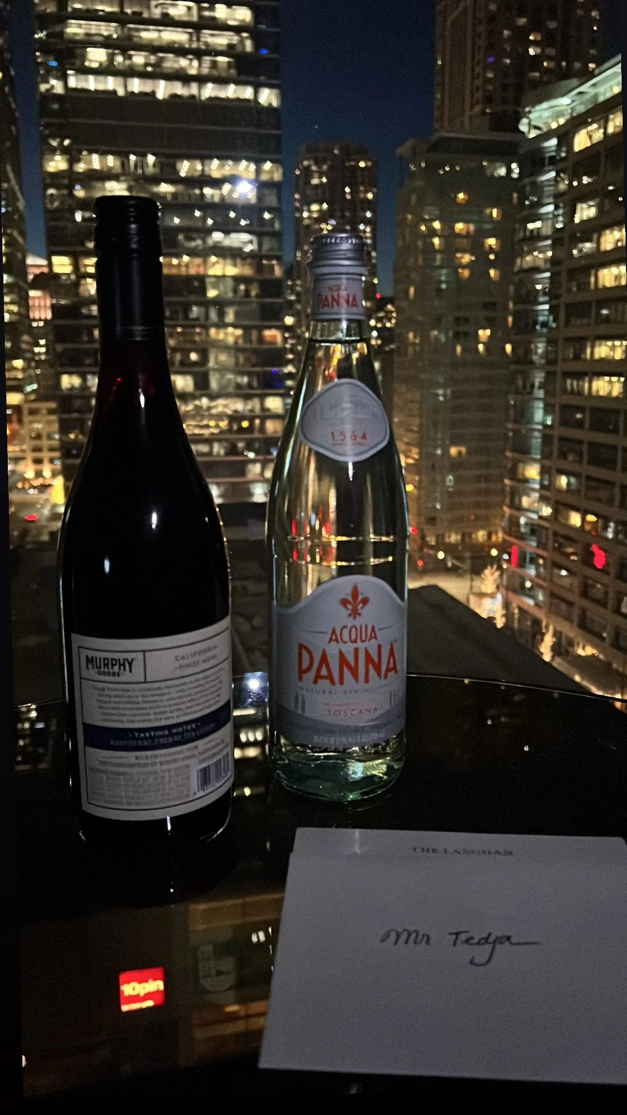 After a brief walk in the disgustingly cold Chicago outdoors, I decided to head back inside to hibernate. I must’ve been very tired, because I was woken up by a knock on the door by an employee attempting to deliver a welcome gift of a bottle of wine, Acqua Panna still water, and a note from the General Manager of the hotel welcoming us for the three night stay. Also note how night had fallen in the picture on the right- this meant I was asleep for maybe 6 hours.
